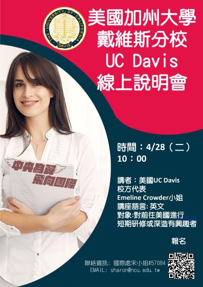 此線上講座將邀請UC Davis的校方代表Emeline Crowder小姐親自說明,歡迎對前往美國交換或深造有興趣的您報名參加!