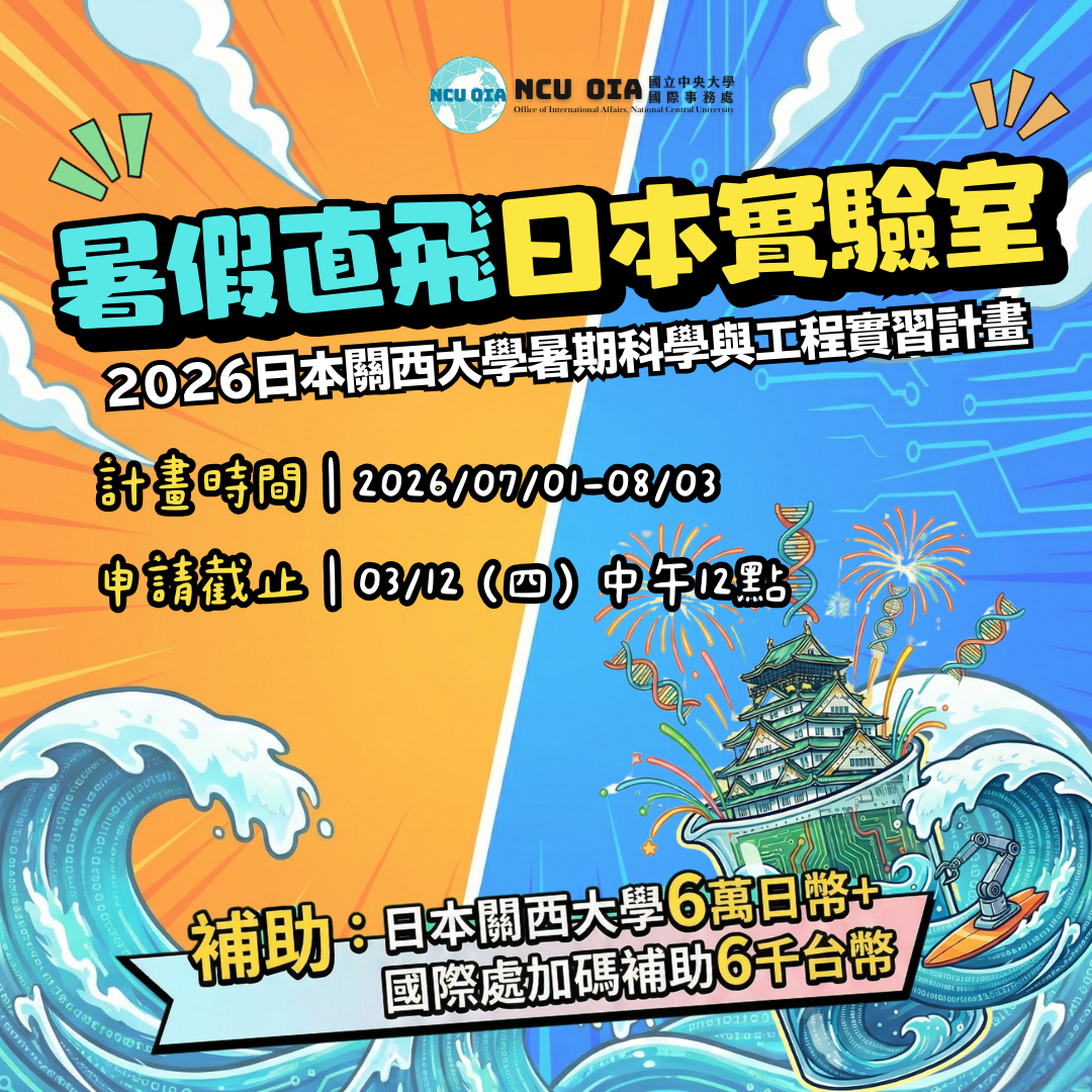 國立中央大學與日本關西大學為推動兩校的雙聯碩士學位合作並提升學生研究經驗及能力,特別推出本項實驗室科技與工程實習計畫,提供雙方學生在理、工、資電及生醫理工領域之實習機會。本計畫根據學生的研究主題及教授可容納的人數分派實驗室,計畫期間參與學生在當地教授的指導下進行研究,研究主題及內容將由學生與教授討論決定。
