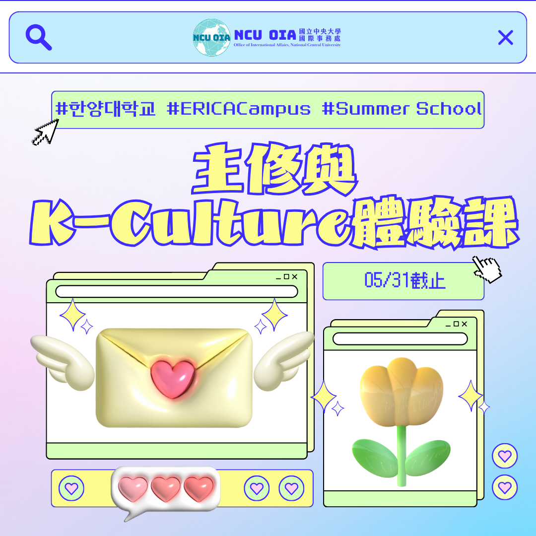 校內報名流程:完成表單 → 計劃申請系統填寫 (選海外營隊) → 營隊名稱請選「韓國漢陽大學暑假課程」→ 印出申請單並核章(導師/指導教授、系主任[至系辦蓋章]、院長[至院辦蓋章]) → 繳交計劃申請單及紙本文件至國際處給承辦人