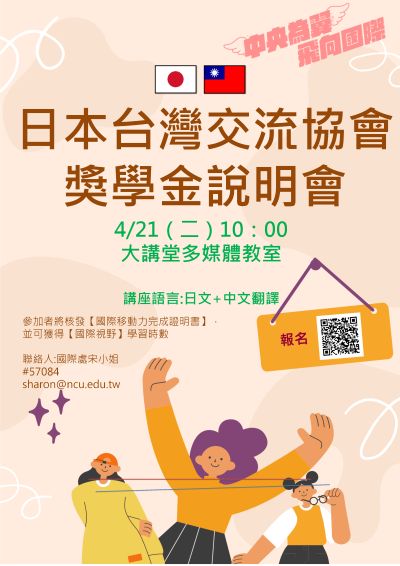 公益財團法人日本台灣交流協會,本部設於東京,另設有台北事務所及高雄事務所。此次國際處特別邀請了日本台灣交流協會親臨中大為同學們說明交流協會提供了哪些獎學金機會?若你對赴日短期學習、研究或留學有興趣者,都歡迎來參加喔!