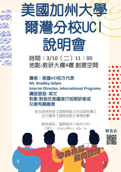 此講座邀請UCI的校方代表Mr. Bradley Gilpin主任親自蒞臨中大說明,歡迎有興趣的您報名參加!